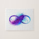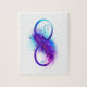 Símbolo infinito com uma bela pena pintada em cores roxas e azuis brilhantes sobre fundo branco.