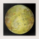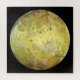 Io é a lua vulcânica amarela de Júpiter. O amarelo é enxofre, e os fragmentos negros e laranja são vulcões.