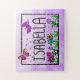 Isabella quebra-cabeça com flores roxas e rosadas, borboletas e bolinhas.