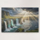 Isle of Legends Coastal Waterfall Jigsaw Puzzle captures the breathtaking beauty of a mythical island where dramatic cliffs rise above the sea and cascading waterfalls tumble into the ocean below. Bathed in the warm glow of sunrise, this enchanting scene blends rugged coastal landscapes with a sense of ancient legend and untamed wonder. The vivid blues of the water, golden light on the cliffs, and misty waterfall details create a rich, immersive puzzle experience that is both relaxing and rewarding.