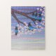 Imagem de 5 gaiolas de estendedor (Cyanocitta stelleri) sentados nos ramos de uma cerejeira. Os pássaros têm rostos pretos, rajadas, peito, e partes superiores das asas, suas barrigas, asas e cauda são azuis. Eles estão empoleirados em galhos cobertos por flores pastel de cereja cor-de-rosa. O céu atrás deles é uma massa de cor estriada: pergueiro, azul-céu, ciano, roxo, violeta, lavanda, mauve, rosa, amarelo e cinza. Esta é uma ilustração colorida inspirada na natureza, excelente para qualquer passarinho.