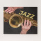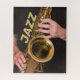 Para fãs de música jazz! Um desafiante quebra-cabeça de quebra-cabeça que mostra a foto de um jazzman tocando sua buzina de saxofone tenor vestida no tempo, e a palavra "JAZZ" impressa em letras maiúsculas douradas. Divertido para toda a família! NOTA: Imagem não projetada para o estilo quebra-cabeça quadrado.
