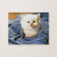 Quebra-cabeça de jogo mostrado com uma impressão de foto de um gatinho fofo no bolso de jeans azuis. Personalize este item ou comprar como está. Imagem do stock