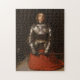 Esta design apresenta uma pintura do artista inglês Sir John Everett Millais, que foi um dos fundadores da Irmandade Pré-Raphaelita. É uma representação poderosa e introspectiva da heroína francesa, capturando-a num momento de profunda ligação espiritual. Pintado em 1865, esse trabalho exemplifica a dedicação Pré-Raphaelita de Millais a detalhes, precisão histórica e profundidade emocional. Joana d'Arc é representada ajoelhando-se no interior de uma sala com pano de madeira; ela está vestida com um cheio de armadura. O cenário é simples, focando toda a atenção na própria Joan. A armadura, feita com precisão meticulosa, brilha com uma haste metálica, destacando a habilidade de Millais em capturar a textura e o peso do material. Isso contrasta com a face jovem e serena de Joan, que é suavemente iluminada, enfatizando sua pureza interna e devoção. A postura de Joan é de humildade, submissão, religiosidade e oração; ela ajoelha-se no chão da pedra, as mãos amontoadas ao redor do monte de uma espada que ela segura na vertical diante de si. A espada, símbolo da sua missão divina e do seu papel marcial, é central na composição. O olhar de Joan é voltado para cima, seus olhos cheios de uma mistura de determinação e fervor espiritual, como se ela estivesse recebendo orientação de Deus nos céus. A paleta colorida da pintura é subjugada, com tons mutados que melhoram a solenidade da cena. O fundo escuro serve para desenhar o foco do espectador em Joan, criando uma atmosfera íntima, quase sagrada. A brincadeira de luz e sombra através de sua armadura e face acrescenta profundidade e dimensão à obra, fazer Joan parece fisicamente castigada e espiritualmente elevada. A representação de Millais de Joana d'Arc é uma homenagem ao seu significado histórico e uma meditação sobre os temas da fé, do dever e da inspiração divina. A pintura ressoa com uma sensação de força silenciosa e determinação inabalável, retratando Joan não apenas como uma guerreira, mas como uma jovem profundamente ligada ao seu chamado espiritual. Por meio dessa pintura, Millais capturou a própria essência do personagem de Joan: sua coragem, sua piedade e sua prontidão para cumprir sua missão dotada de Deus.