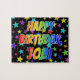 Esta animada, vibrante, design de quebra-cabeça de quebra-cabeça com tema de aniversário tem a mensagem "HAPPY BIRTHDAY, JODI" com os personagens que têm um espectro colorido de arco-íris inspirado em um padrão de gradação, além de um campo divertido de estrelas como padrão de fundo. Um quebra-cabeça excitante como este pode ser uma maneira divertida de enviar cartões de aniversários a alguém chamado Jodi. [~Z0000468]