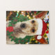 Uma pintura digital de um filhote pronto para o Natal com uma coroa, chapéu de Papai Noel e uma árvore decorada.