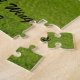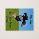 Quebra-cabeça de cavalo divertido com um cavalo e cavaleiro pulando sobre uma grande cerca com flores em cada lado e o ditado "Salta!" no fundo da cerca.