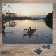 This photographic jigsaw puzzle captures the quiet silhouette of a kayaker gliding across glass-still water at sunrise, as layered hues of amber, soft orange, and early-morning blue reflect across the lake. The peaceful symmetry between sky and water creates a meditative, almost timeless atmosphere—one that invites stillness rather than motion.
