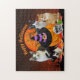 Aqui está um quebra-cabeça de serra que foi criado para crianças. Esta quebra-cabeça de serra de Halloween apresenta uma lua laranja assustadora, num céu negro com lápides, gatos vadios e uma bruxa de abóbora. Há também uma camada de crânio, aranha e garrafa de poção mágica. Os gatos foram cortados das fotografias e pegados na quebra-cabeça como uma camada. A abóbora, o crânio, a aranha e os chapéus de bruxa são ilustrações que também foram adicionadas para criar esse design único.