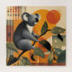 Koala sitting in a tree branch with colorful abstract art background.