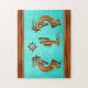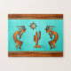 Aproveite este Quebra-cabeça único sudoeste de Kokopelli! Possui dois copos do sudoeste de Kokopelli dançando e tocando a flauta em volta de um cacto sob o sol em um fundo de turquesa... cercado por uma borda de cobre! Este é um Design de Arte Original do Artista Kerry Miller.