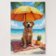 A cheerful Labrador Retriever enjoying a sunny beach moment under a bright umbrella with fresh fruits and ocean views. The painterly style creates a warm and inviting coastal vibe.