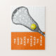Quebra-cabeça de esporte criativo de lacrosse com uma citação engraçada e um bastão de lax e bola em fundo laranja.