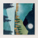 Uma bela paisagem com texturas únicas mostrando uma paisagem de lago de montanha com lua ascensão e céu estrelado em tons de azul, ouro, verde e turquesa.