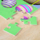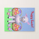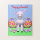 Um quebra-cabeça de Páscoa divertido com meu trabalho de arte de uma linda personagem de carneiro com cestos de ovos de Páscoa pintados e flores brilhantes de primavera. Texto personalizável diz "Felz pascoa!"