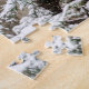 Um leopardo de neve dos jovens espreita para fora entre de um arbusto coberto de neve bonito.