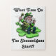 Um leprechaun irlandês que senta-se em um trevo do trevo. Está pedindo 'quando os shenanigans começam? Excelente para o dia de St Patrick!