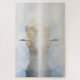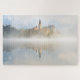 Foto de quebra-cabeça de um nascer do sol nebuloso no lago Bled com reflexo da ilha com a igreja na água do lago e com o Castelo Bled ao fundo num belo dia de outono na Eslovênia.
