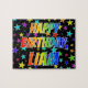 Esta vibrante e excitante design de quebra-cabeça de quebra-cabeça com tema de aniversário apresenta a mensagem "HAPPY BIRTHDAY, LIAM" com os personagens que têm um espectro colorido de arco-íris inspirado em um padrão de gradação, junto com um padrão de fundo divertido de campo estelar. Um quebra-cabeça colorido como este pode ser uma maneira divertida de reconhecer o aniversário de alguém chamado Liam. [~Z0000468]