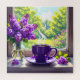 Um bonito quebra-cabeça com uma bela ilustração de uma vibrante lilases roxas, sentados num vaso de vidro, junto a uma xícara de vapor de café quente num dia brilhante de Verão.