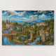 Uma aldeia tranquila fica no campo, com montanhas à distância. Um riacho pacífico flui através dos jardins da vila, destacando os arredores coloridos e a natureza que abunda entre a antiga arquitetura.