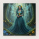 Uma bela fada vestindo um vestido lacrimogêneo e um colar feito de pedras aquamarinas com narcisos e aquamarinos em seus longos cabelos de cor lacrimogênea e asas leves de libélula, de cor lacrimogênea, segurando um daffodil em uma floresta mágica cercada por cogumelos azuis, daffodils amarelos e árvores mesas.