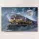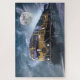 uma locomotiva moderna contra um céu estrangeiro e uma Lua cheia.