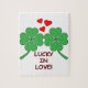 Sorte no amor. Desenhos de trevas de quatro folhas com formas cardíacas flutuando sobre elas.