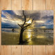 Raios solares do céu brilham através de nuvens até areia molhada, ouro, praia. Uma árvore de madeira derivada em pé se aproxima do sol. Magnífico céu azul e branco nublado, horizonte oceânico e luz do sol refletindo na água do oceano. Foto dramática, mas pacífica, da praia de Beaufort, SC, e digitalmente melhorada.