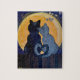 Gatos apaixonados mostrando seu afeto um ao outro, apreciando o cenário romântico - a lua de cheio de ouro. Quebra-cabeça original para todos os amantes de gatos e quebra-cabeça.