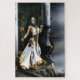 A bruxa/feiticeira preta toda em branco e ouro com seu dragão preto em uma trilha na borda do penhasco.