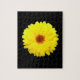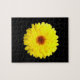 Esta quebra-cabeça espetacular mostra uma foto de uma bonito flor amarela de marigold em fundo preto.