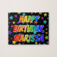 Esta vibrante, divertida, design de quebra-cabeça de quebra-cabeça com tema de aniversário exibe a mensagem "HAPPY BIRTHDAY, MARISSA" com os personagens que têm um espectro colorido de arco-íris inspirado em um padrão de gradação, além de um campo vivo de estrelas como padrão de fundo. Um quebra-cabeça empolgante como este pode ser uma maneira divertida de enviar desejos de aniversário a alguém chamado Marissa. [~Z0000468]