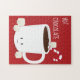 Quebra-cabeça de Jigsaw com um design de desenho ilustrado de uma caneca sorridente de chocolate quente e marshmallows com uma cana doce. As palavras "Chocolate quente" aparecem no canto superior esquerdo. Todas as palavras podem ser personalizadas.