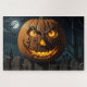 Passe a noite montando um quebra-cabeça de quebra-cabeça com uma pega-lanterna perversa, com olhos laranja brilhantes que saem de cima de um posto de cerca meteorizada sob uma lua de cheio, cercado por uma noite escura e cheia de morcegos.