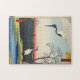 Hiroshige: Minowa, Kanasugi, Mikawashima, 1857. O impressão do japonês do vintage mostra dois guindastes. Woodcut da cor por Andō Hiroshige. No. 102 na série Meisho Yedo Hiakkei (cem vistas famosas de Edo), 5o mês de 1857.