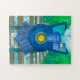 Um quebra-cabeça conhecido feito sob encomenda do divertimento para os miúdos que caracterizam um trem do vapor com um condutor amigável que viaja abaixo das trilhas do trem com as árvores verdes ilustradas com aguarela.