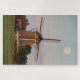 Quebra-cabeça de serra de vaivém de um moinho de vento tradicional sob uma Lua cheia no início da noite nos Países Baixos.