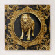 Uma imagem impressionante que apresenta um lobo negro contra um quadro decorativo de ouro luxuoso, evocando um senso de mística e poder. O contraste entre o pelo elegante e dourado do lobo e os detalhes intrincados e elegantes da moldura cria uma composição visualmente cativante.