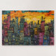Um Jack Ohman inspirou a paisagem da cidade de aquarela no pôr do sol. Os prédios são esmagados juntos e erguidos em direção ao céu, mostrando suas cores pastéis. O sol está se pondo, fornecendo um plano de fundo laranja vibrante.
