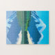Quebra-cabeça num quadro digital de montanhas e florestas de pinheiros com capas de neve, refletido num lago, sob um céu azul profundo