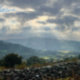 Brecon Beacons - Parque Nacional de Banana Brycheiniog. Montanhas Negras no sul do País de Gales. Paisagem de Welsh Countryside. A fotografia apresenta maravilhosos eixos de luz de um céu dramático.