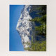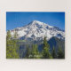 Uma montanha com capas de neve sobe majestamente sob um céu azul claro, com pinheiros verdes e peludos em primeiro plano contrastando com as encostas rochosas. A cena exude um senso de tranquilidade e beleza natural. Esta montanha é o Monte Rainier e também conhecida como Tahoma.