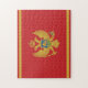 Bandeira do Montenegro. A bandeira do Montenegro (Montenegro: Zastava Crne Gore, З а а в т а Ц р с н е Г о р е das) foi oficialmente adotada, sob proposta do governo do Montenegro, com a Lei sobre os símbolos do Estado e o dia do Estado do Montenegro, em 13 de julho de 2004. Foi sancionada constitucionalmente com a proclamação da Constituição em 22 de outubro de 2007. É uma faixa vermelha com bordas mais largas do ouro ao redor do campo vermelho com o casaco de braços do Montenegro no seu centro. A carga sobre o casaco de armas é uma águia de duas cabeças que é um símbolo da origem bizantina e, em última análise, romana. Ela simboliza a dupla autoridade, como a que existe sobre a igreja e o Estado. O passante de leão na escuta é um sinal da autoridade episcopal e poderia ter sido inspirado pela metáfora do Leão de Judah. Além disso, tem alguma semelhança com o motivo presente nos braços de Veneza, que teve uma influência considerável na história do Montenegro.