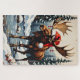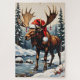 This bold, rustic linoleum block print features a giant bull Moose, wearing a comical oversized Santa hat, with its magnificent antlers naturally decorated with pine cones and cranberries. A rugged and unique holiday design.