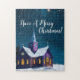 Este gráfico em camadas, retrata uma igreja de roxo coberta de neve, inclinada, com janelas brilhantes, sobre uma deriva de neve, alta, árvores ao fundo, contra um céu estrelado, à meia-noite, de azul profundo, e verde, misturado, exibindo um Cartões de natal familiar. Esta cena lembra-nos a todos, porque celebramos tão alegre, e sagrado, com os nossos entes queridos, nesta época do ano!