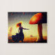 Trabalho de arte psicodélico com uma mulher e um enorme cogumelo, paisagem abstrato.