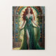 mulher feia com cabelo vermelho e olhos verdes fluidos vestida com um vestido diafanoso parado em frente a uma janela de vidro manchado. com designs intrincadas e com cabelo vermelho. A janela de vidro manchado apresenta padrões geométricos e usa uma variedade de cores, predominantemente matizes verdes e amarelas. A estética geral é medieval ou inspirada na fantasia.