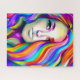 Quebra-cabeça em meio abstrato, moderno século médio inspirado, retrato de uma mulher com cabelos longos, fluidos, arco-íris em cores primárias vívidas