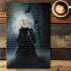 Mulher cabeleira branca, num belo vestido preto gótico vitoriano e cortado. Raven, neblina e floresta ao seu redor